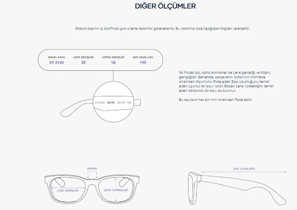 İlk sayı model adıdır, ardından lens genişliği ve köprü genişliği gelir. Genellikle şakak uzunluğunu veya çerçevenizin ‘kollarının’ ölçüsünü temsil eden üçüncü bir sayı vardır. Bazen mercek yüksekliğini gösteren dördüncü bir sayı bulunur. Bu sayıların her biri mm cinsinden ölçülür.
