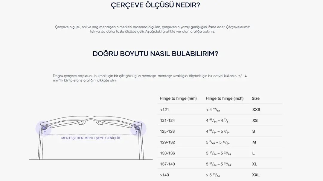 Doğru çerçeve boyutunu bulmak için, hâlihazırda sahip olduğunuz ve size tam oturan gözlüğün menteşe-menteşe mesafesini bir cetvel kullanarak ölçün. Yaklaşık ±4 mm’lik tolerans aralığını göz önünde bulundurun.